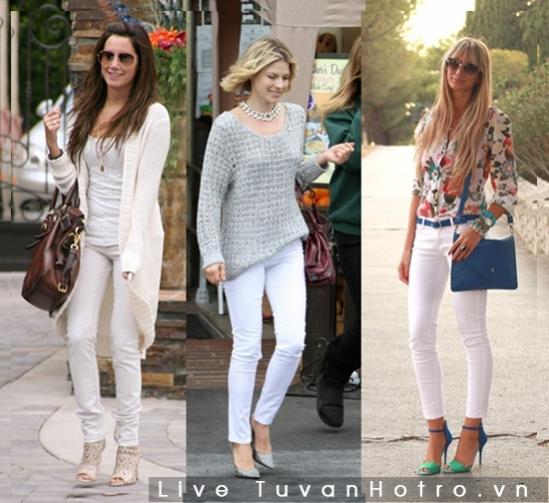 Những chiếc jeans trắng thật sự rất dễ phối hợp với các trang phục, phụ kiện khác và luôn giữ được phong cách thanh lịch, sang trọng cho người mặc, bởi màu trắng từ lâu đã được xem là màu của giới thượng lưu. Một chiếc jeans trắng có thể kết hợp cùng áo sơ mi hay thun màu trơn, từ tương phản trắng đen hay nguyên cây trắng, họa tiết hoa văn sặc sỡ… đều luôn hoàn hảo.