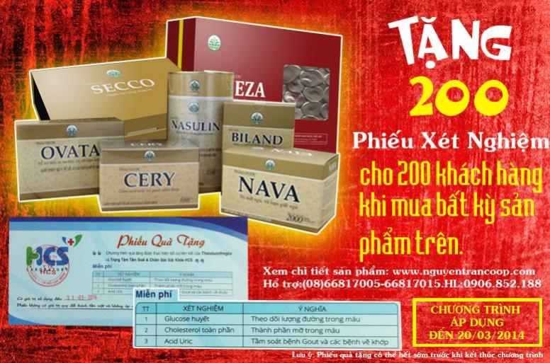Nguyễn Trần Coop tặng phiếu xét nghiệm bệnh: Tiểu đường, Cao huyết áp, Gout, khớp khi mua bất kỳ 01 sản phẩm sau tại website: Nguyễn Trần Coop