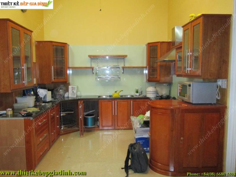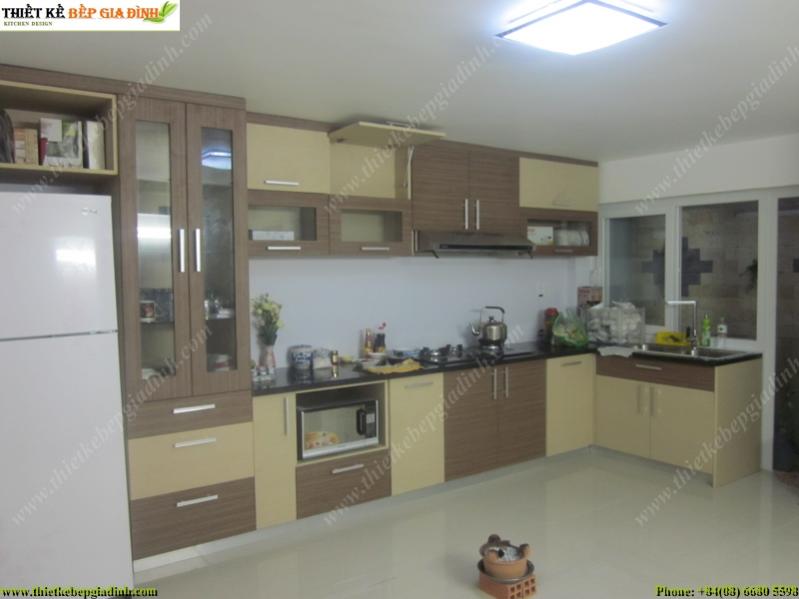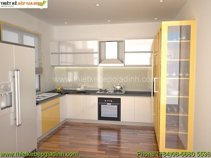 Thiết kế hệ tủ bếp lớn ốp tường giúp gia chủ có nhiều lựa chọn trong việc lưu giữ đồ dùng gia đình, tiện lợi trong sinh hoạt và sử dụng.
