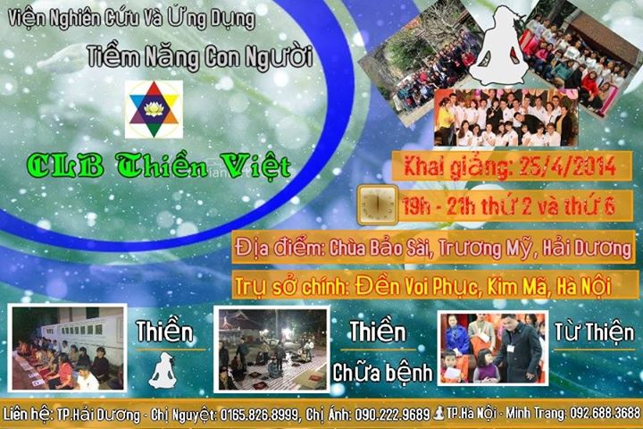 P/S: Các bạn ở Thành Phố Hà Nội thân yêu muốn tham gia lớp thiền xin liên hệ với Bạn Minh Trang (CLB Thiền Việt) 0926883688 và Bạn Hương Hà (CLB Thiền Việt) 0932275008, địa chỉ học tại Đền Voi Phục Thủ Lệ, Kim Mã , Đống Đa, Hà Nội.