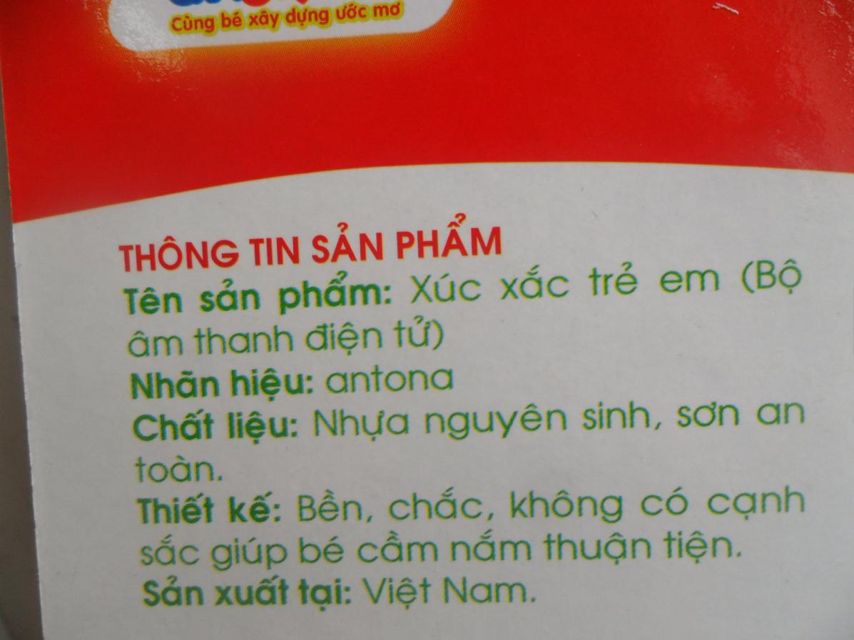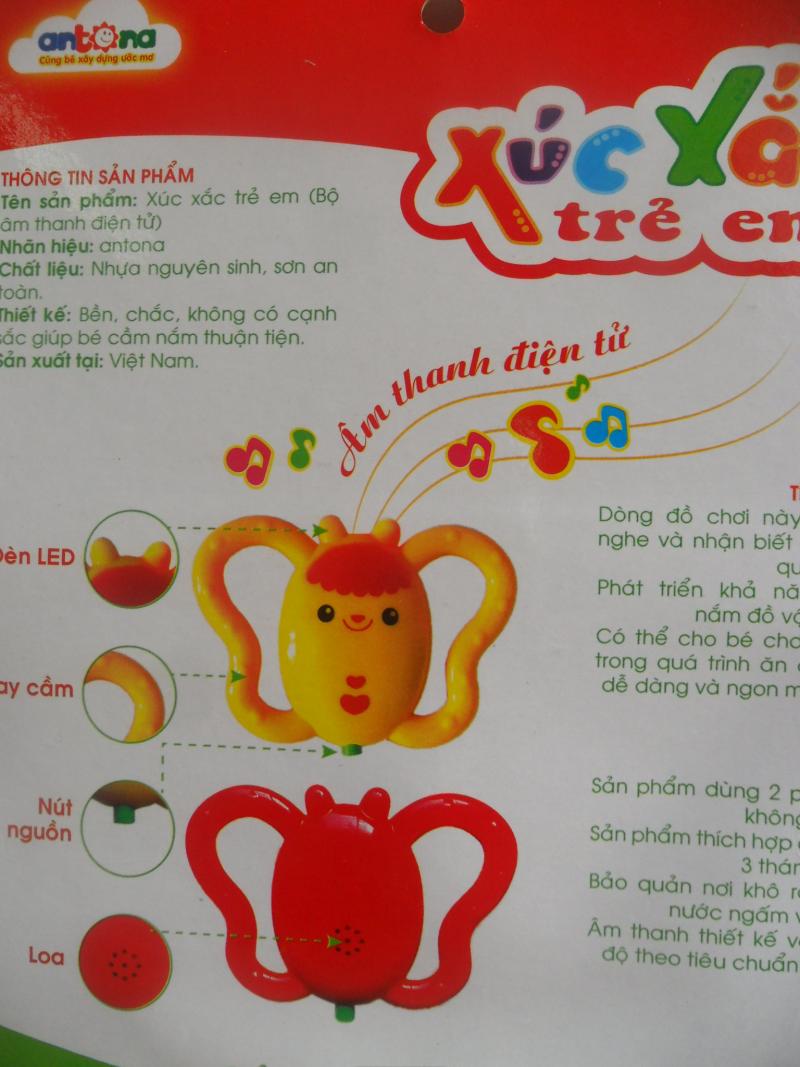 Trong thời gian vừa qua công ty đồ chơi an toàn Việt Nam Antona đã cho ra đời sản phẩm mới mang tên " Xúc xắc âm thanh". Đây là dòng xúc xắc điện tử được nằm trong bộ sản phẩm xúc xắc dành cho trẻ em. Được thiết kế với hình dạng giống như hình con bướm thật, một con vật gần gũi với các bé. Được sản xuất 100% bằng nhựa nguyên sinh ABS không độc hại,thiết kế không cạnh sắc, pin 3V,âm thanh vừa phải, nên các mẹ có thể hoàn toàn yên tâm khi bé ngậm, cắn mà không hề nguy hiểm hay ảnh hưởng gì đến sức khoẻ của bé.