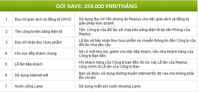 Văn phòng ảo gói Save: thường được những đối tượng doanh nghiệp hoặc cá nhân vừa khởi nghiệp ưa chuộng , bạn muốn tiết kiệm chi phí nhất có thể những vẫn bảo đảm được những thiết bị cơ bản cho 1 văn phòng , và sự lựa chọn Văn phòng ảo tại gói giá này sẽ đáp ứng được yêu cầu đấy của bạn. Đây cũng là mức giá đang được nhiều doanh nghiệp lựa chọn.